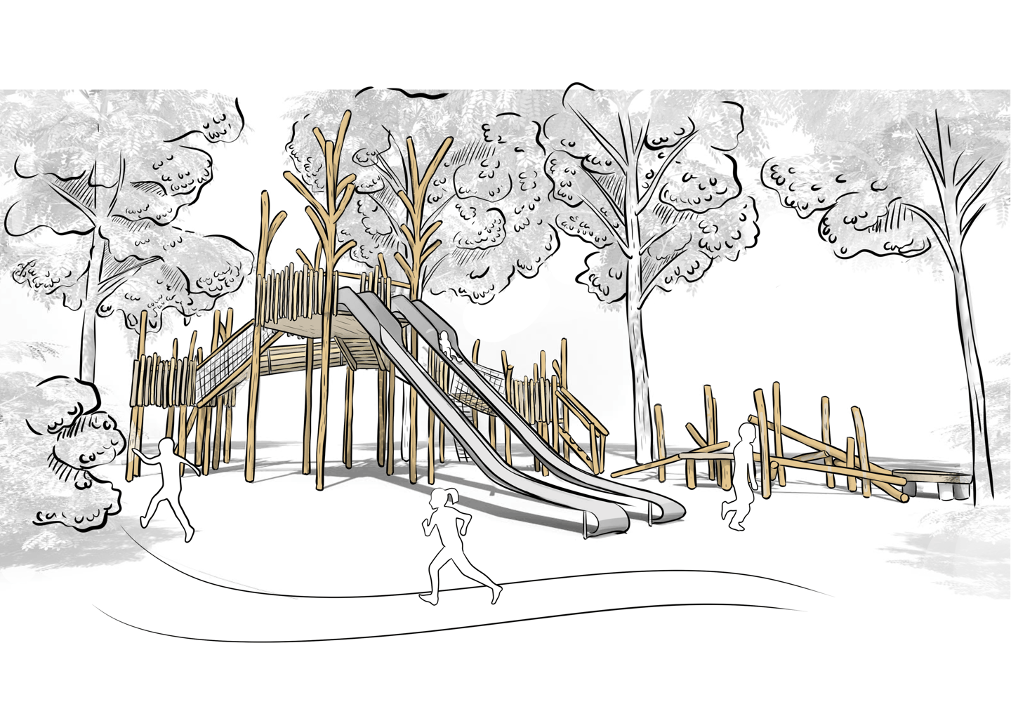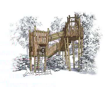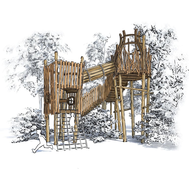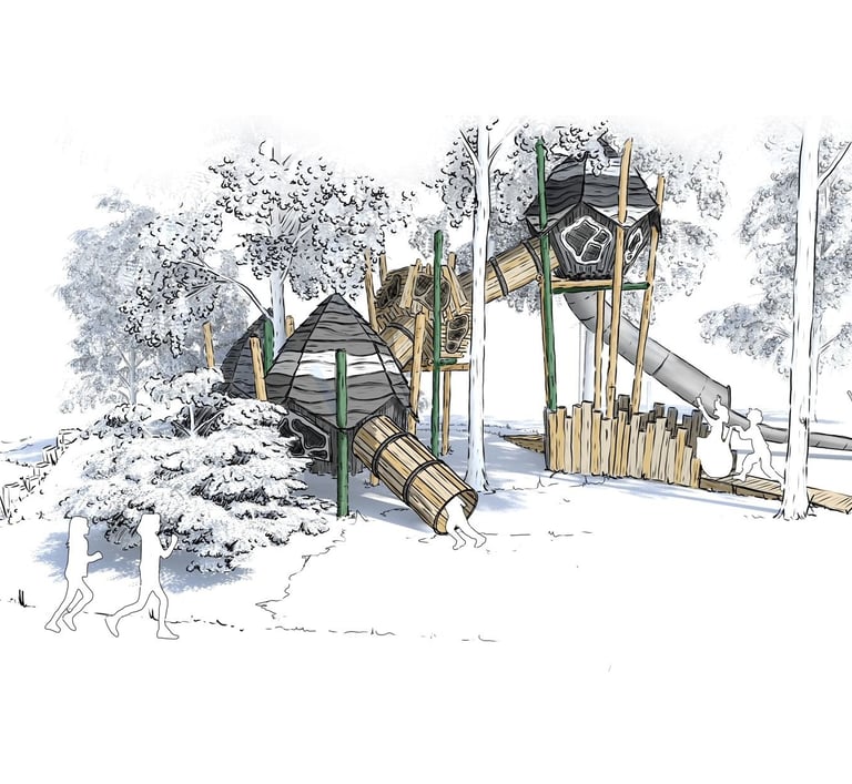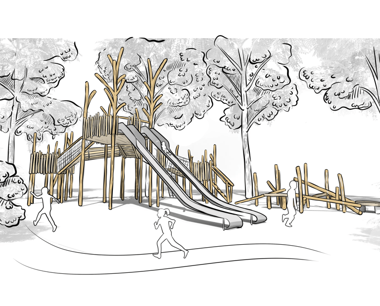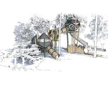The wood themed design has been intentionally chosen to blend into the landscape, ensuring the playground feels like a natural extension of the forest rather than an addition imposed upon it.