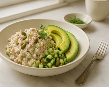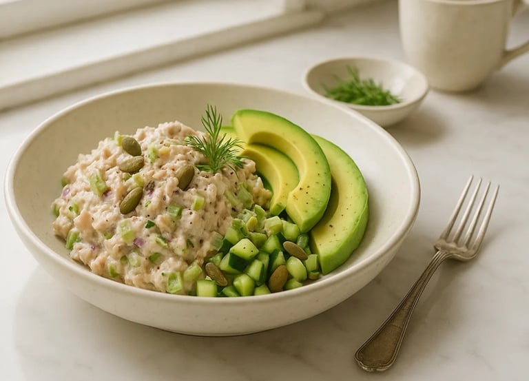In a bowl, mix the tuna with Greek yogurt, lemon juice, olive oil, and seasoning until the mixture becomes smooth and creamy. Gently fold in the diced celery, red onion, and cucumber to add texture and freshness. Arrange avocado slices on top and sprinkle with seeds for extra crunch, then finish with fresh herbs and a little extra black pepper. Serve chilled, and enjoy on its own or with rice cakes or pitta if desired.