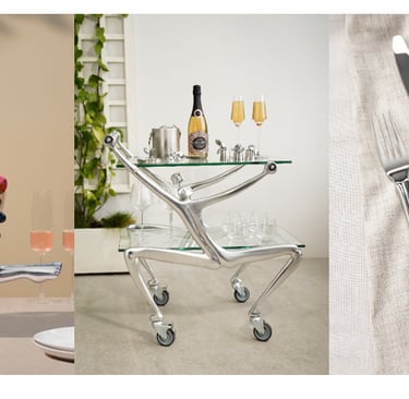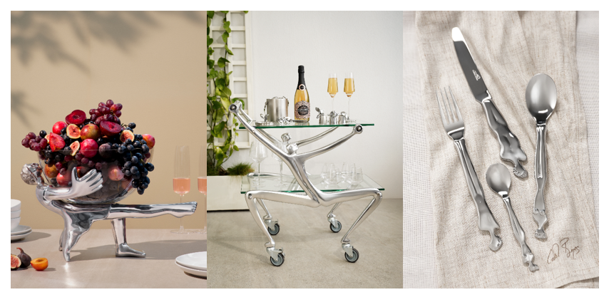 Among the standout sculptural pieces are the All Dressed Up Glass Bowl and Stand, a striking centrepiece ideal for layered desserts, fresh flowers or fruit displays. The Reclining Champagne Cooler adds a playful yet luxurious touch to celebrations, while the ‘Man’ Drinks Trolley stands as a true showpiece, crafted from aluminium and glass and embodying the brand’s celebrated human-form design language. Alongside these hero items sits an extensive selection of glassware, cutlery, salad servers and gifting accessories, perfectly timed for Mother’s Day, wedding season and meaningful milestones throughout the year.