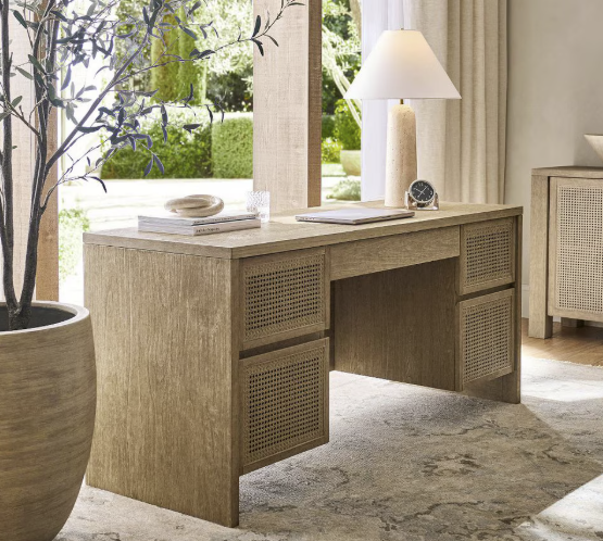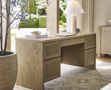 Furniture pieces such as the Blair Herringbone Sideboard and Marina Cane Executive Desk balance craftsmanship with practicality, while the Preston Swivel Armchair offers comfort that works just as well in a living room as in a home office. Decorative details like the Chambray Tile Stoneware Dinnerware and playful Resin Dominoes Set bring personality to shelves and tabletops, adding warmth to everyday moments.