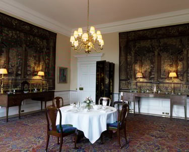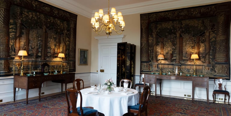 The room is decorated with striking Flemish tapestries that were woven around 1650. Their design features a pergola framing an elaborate vase overflowing with flowers. These impressive textiles were installed in the room in the 1920s at the request of King George V and Queen Mary, the grandparents of Queen Elizabeth II.