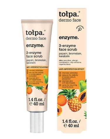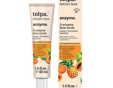Tolpa Dermo Face Enzyme Face Scrub is an at-home exfoliating treatment designed to refresh and refine the complexion as part of a balanced skincare routine. Combining enzymatic exfoliation with fine microcrystals, it helps lift away dull surface skin and deeply cleanse pores, revealing a smoother, softer and more even-looking finish.