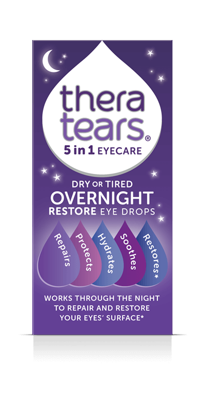 TheraTears Overnight Restore is a nighttime eye drop treatment designed to support eye comfort and hydration while you sleep. Formulated for dry, tired or irritated eyes, the preservative-free drops work overnight to replenish moisture and soothe discomfort that can build up over the day.
