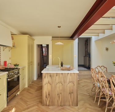 Dubbed the Yellow Kitchen Effect, the movement is all about embracing colour in the hub of the home to create spaces that feel instantly warmer and more optimistic. In one standout example, bespoke kitchen makers Olive & Barr have introduced buttery yellow cabinetry paired with a richly grained wooden island. The result is a room that feels brighter and more inviting from the moment you step inside.